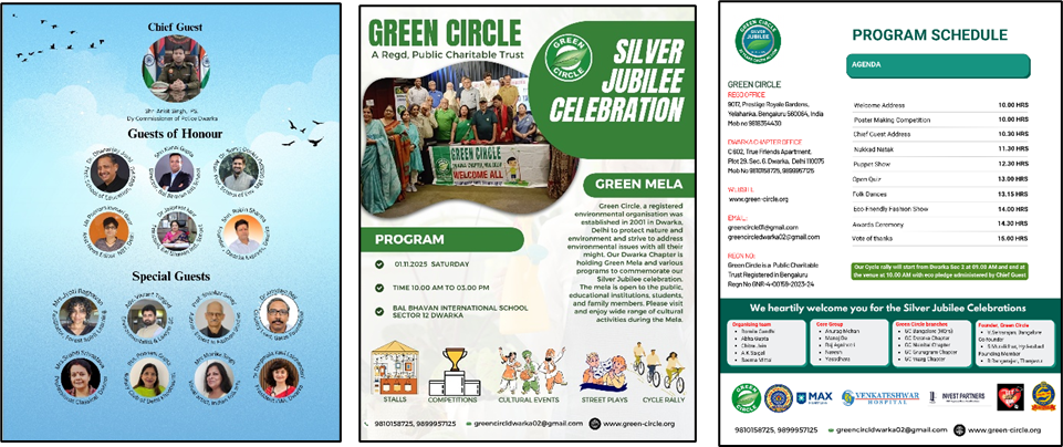 Green Circle, a voluntary environmental organization that began its journey in Dwarka 25 years ago, proudly celebrates its Silver Jubilee Year. Founded with the vision of creating a cleaner, greener, and more sustainable community, Green Circle has grown into one of the most active and respected environmental groups in the region. Over the years, Green Circle has undertaken a wide range of impactful initiatives to promote environmental awareness, community participation, and ecological preservation. Its consistent efforts have inspired citizens, schools, and institutions to join the green movement. To commemorate its Silver Jubilee, Green Circle is organizing a grand community event, “Green Mela 2025” on 1st November 2025 at Bal Bhawan International School, Sector-12, Dwarka. The Chief Guest of the day is Shri Ankit Singh IPS, Deputy Commissioner of Police, Dwarka. The Guests of Honour are: Dr Dhananjay Joshi, Professor GGSIP, Kunal Gupta, Director Bal Bhavan International School, Dr Sumit Dookia- Professor GGSIPU, Poonam K Gaur, Asst. News Editor NBT, Dr Jaspreet Kaur, Principal Bal Bhavan International School, and Robin Sharma, Founder Dwarka Express. Eminent persons like Adv. Vikrant Tongad, Dr.Deepmala, Jyoti Raghavan Dr Arindam Ray, Shristi Srivasthava, Prof. Shankar Sahay, Poonam Gupta and Monika Singh will be the special guests. The event will bring together 50+ schools and over 1000 participants, featuring eco-stalls, painting and poster competitions, street plays, cultural performances, and interactive environmental sessions under the theme “Environment First, Efforts Must.” An estimated 2,500 footfalls are expected.